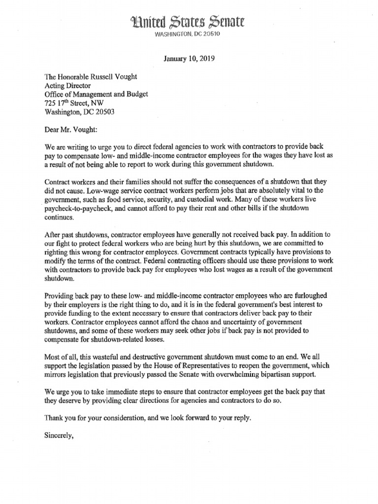 Letter to OMB on Contractor Employee Back Pay