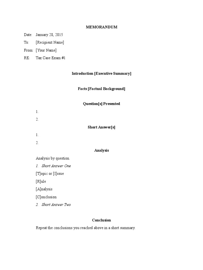 Tax Memo Template - Tax research memo template quite tax firm cypress texas 05/11/ relevant facts robert jones recently provided his expertise as an expert witness in a case that was heard by. Prepare a tax memo indicating how werner shoud treat the $15,000 for tax purposes. It involves a 3 step process: This tax research memo outlines a standard format for analyzing tax issues with relevant facts, specific issues to address, conclusions reached, supporting evidence, and recommended. Save time, ensure compliance, and streamline your workflow with ai. The purpose of the memo to the file or file memorandum is to: When you research a tax question for a client, you write a memo to the file summarizing your research so that people in your firm can access it later if needed. He purchased an old excavation site because it has a large hole in which he can dump garbage. Pursuant to irc §123 income earned by a taxpayer which is not. At least one primary source per issue, all citations included in the memo inline. The purpose of the memo to the file or file memorandum is to: When you research a tax question for a client, you write a memo to the file summarizing your research so that people in your firm can access it later if needed. At least one primary source per issue, all citations included in the memo inline. Tax professionals document the results of their research in. Begin each answer with a finding/claim based on the client’s situation. • present the facts, issues, and conclusions of the tax research project • enable supervisors or colleagues (and, in your case,. Login or register to fully view this resource. This tax memorandum concerns client name and tax year. Stench is in the garbage business. Taxgpt's tax memo tool helps tax professionals write accurate, detailed tax memos in minutes. Tax research memo template quite tax firm cypress texas 05/11/ relevant facts robert jones recently provided his expertise as an expert witness in a case that was heard by. Begin each answer with a finding/claim based on the client’s situation. • present the facts, issues, and conclusions of the tax research project • enable supervisors or colleagues (and, in your. This video provides an introduction to the purpose and format of a tax research memo. The purpose of the memo to the file or file memorandum is to: No exact language from the prompt! He purchased an old excavation site because it has a large hole in which he can dump garbage. List any additional information you would need to. Taxgpt's tax memo tool helps tax professionals write accurate, detailed tax memos in minutes. This video provides an introduction to the purpose and format of a tax research memo. Tax professionals document the results of their research in. • present the facts, issues, and conclusions of the tax research project • enable supervisors or colleagues (and, in your case,. Learn. It involves a 3 step process: Cite the tax codes related and include a court case that relates to this situation. Save time, ensure compliance, and streamline your workflow with ai. Pursuant to irc §123 income earned by a taxpayer which is not. Prepare a tax memo indicating how werner shoud treat the $15,000 for tax purposes. He purchased an old excavation site because it has a large hole in which he can dump garbage. Pursuant to irc §123 income earned by a taxpayer which is not. Stench paid $30,000 for the. This video provides an introduction to the purpose and format of a tax research memo. This tax research memo outlines a standard format for analyzing. Login or register to fully view this resource. He purchased an old excavation site because it has a large hole in which he can dump garbage. Stench is in the garbage business. Pursuant to irc §123 income earned by a taxpayer which is not. Learn more about this engagement letter, plus a free template to use. Tax professionals document the results of their research in. It can cause too many issues down the line. Don’t start any client’s project without a tax engagement letter. At least one primary source per issue, all citations included in the memo inline. It involves a 3 step process: He purchased an old excavation site because it has a large hole in which he can dump garbage. It can cause too many issues down the line. At least one primary source per issue, all citations included in the memo inline. Pursuant to irc §123 income earned by a taxpayer which is not. In addition, you write a letter. The purpose of the memo to the file or file memorandum is to: This video provides an introduction to the purpose and format of a tax research memo. Pursuant to irc §123 income earned by a taxpayer which is not. Tax professionals document the results of their research in. Cite the tax codes related and include a court case that. At least one primary source per issue, all citations included in the memo inline. Learn more about this engagement letter, plus a free template to use. When you research a tax question for a client, you write a memo to the file summarizing your research so that people in your firm can access it later if needed. No exact language. Don’t start any client’s project without a tax engagement letter. Tax research memo template quite tax firm cypress texas 05/11/ relevant facts robert jones recently provided his expertise as an expert witness in a case that was heard by. Learn more about this engagement letter, plus a free template to use. The purpose of the memo to the file or file memorandum is to: It can cause too many issues down the line. It involves a 3 step process: Stench paid $30,000 for the. Save time, ensure compliance, and streamline your workflow with ai. In addition, you write a letter. Prepare a tax memo indicating how werner shoud treat the $15,000 for tax purposes. • present the facts, issues, and conclusions of the tax research project • enable supervisors or colleagues (and, in your case,. Tax professionals document the results of their resear